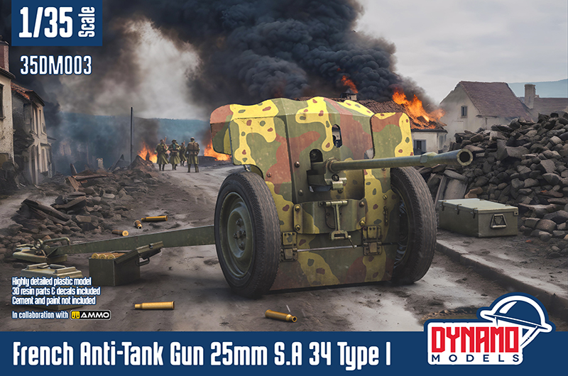 Inside of the box you can find a highly detailed plastic kit of the French Anti-Tank 25mm Gun S.A 34 type I, The mould for this kit is brand new by Dynamo Models