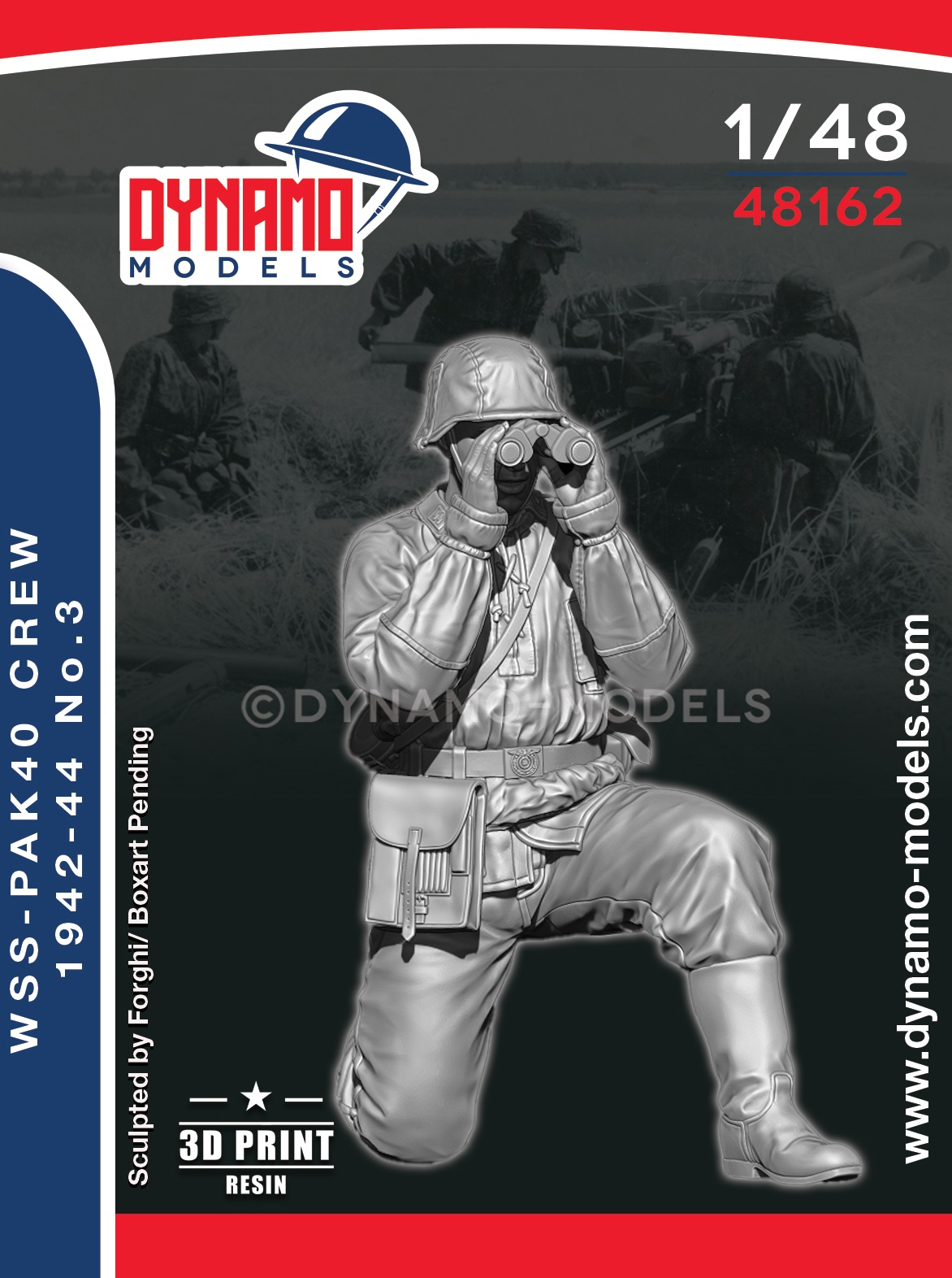 The 1/48 WSS – PaK 40 Crew 1942–44 No.3 by Dynamo Models is a finely detailed 3D printed resin figure representing a Waffen-SS anti-tank gun crewman. Perfect for PaK 40 dioramas from the Eastern or Western Front.